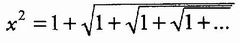 Possiamo sperare di calcolare il valore di un'espressione simile? Un modo piuttosto goffo di avvicinarsi al suo valore potrebbe consistere nel calcolare √(1 + √1) cioè √2, cioè 1,414; quindi calcolare √(1 + √(1 + √1) cioè 1,554, sperando che la serie di valori «converga» (cioè si avvicini progressivamente) a qualche numero. Ma c'è un altro modo, più elegante, di trovare il valore della nostra espressione. Sia x il valore che stiamo cercando. Possiamo scrivere: