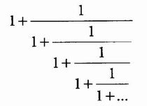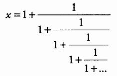 Si noti però che il secondo addendo del membro di destra è uguale al nostro x originario. Perciò: x2 = 1 + x. Ma questa è l'equazione del rapporto aureo! Quindi, la nostra espressione senza fine è uguale a Φ. Occupiamoci ora di un tipo molto diverse di espressioni senza fine, questa volta basato sulle frazioni invece che sulle radici quadrate: