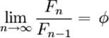 Riconoscete l'ultimo rapporto? Procedendo lungo la successione di Fibonacci, il rapporto tra un termine e il suo precedente oscilla intorno a un numero al quale si avvicina sempre di più;e quel numero è il rapporto aureo. Se indichiamo con Fn l'nesimo numero di Fibonacci e con Fn-1 il termine precedente scopriamo che per n che tende all'infinito, il rapporto dei due numeri tende al numero algebrico irrazionale chiamato Φ.