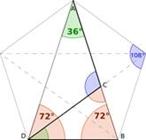 In ogni figura piana regolare la somma di tutti gli angoli in terniè uguale a 180°×(n - 2) dove n è il numero di lati. Per esempio, in un triangolo n=3 e la somma degli angoli è 180°. In un pentagono n=5, e la somma degli angoli è 540°. Immaginiamo ora di tracciare nel pentagono due diagonali adiacenti, ricavando tre triangoli isosceli. Siccome in un triangolo isoscele i due angoli adiacenti alla base hanno la stessa ampiezza, gli angoli alla base dei due triangoli laterali sono uguali a metà di (180° - 108°), cioè a 36°. Pertanto, otteniamo per gli angoli del triangolo centrale i valori di 36°, 72° e 72°. Bisecando uno dei due angoli di 72°, otteniamo un triangolo più piccolo DBC con gli stessi angoli del triangolo maggiore ADB. Con l'aiuto di un po' di geometria elementare, si può dimostrare che in accordo con la definizione di Euclide, il punto C divide la linea AB esattamente