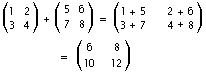 L'esigenza di elaborare informazioni di questo tipo porta a una teoria algebrica in cui le operazioni base dell'aritmetica vengono applicate a intere matrici. Se A e B sono entrambe matrici m × n (matrici che posseggono un diverso numero di righe e colonne non possono essere né sommate, né sottratte), la somma A + B si ottiene sommando ordinatamente gli elementi corrispondenti, ovvero (A + B)ij = aij + bij. Ad esempio: