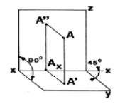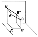 Poniamo ora un punto A nella spazio definito dell'angolo diedro e costruiamo le sue proiezioni. A questo punto fine conduciamo dal punto A le perpendicolari ai piani H e V. I punti di intersezione A' ed A'' delle perpendicolari con questi piani sono dette proiezioni ortogonali del punto A. Ruotiamo ora il piano H attorno all'asse x sino a farlo divenire un'estensione del piano V. Così si ottiene la rappresentazione ortogonale del punto A, indicata in fig.2b. Le perpendicolari condotte dal punto A ai piani di proiezione sono dette rette di proiezione, il punto A' è la proiezione orizzontale mentre il punto A'' è la proiezione verticale
