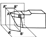 Le proiezioni si otterranno congiungendo nei tre piani di proiezione dei suoi punti d'estremità. Consideriamo lo spigolo AB di fig. 4a che rappresenta il tagliente di un utensile.