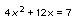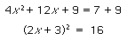 l'espressione 4x2 + 12x potrebbe essere fattorizzata in forma di un quadrato perfetto se fosse completata nel seguente modo: 4x2 + 12x + 9, pari a (2x + 3)2. Dunque, per ottenere la fattorizzazione cercata, si aggiunge un 9 al primo e al secondo membro: