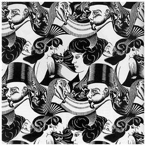 Nacque istintivamente in Escher il bisogno di creare forme che riempissero il piano incastrandosi tra loro cosicché il confine tra i pezzi adiacenti ne avrebbe costituito anche i rispettivi perimetri. [.] La prima stampa conforme a tali principi era un'incisione su legno, "Otto Teste". [.]
