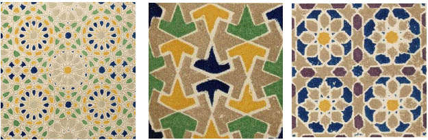 ".Le maioliche geometriche dell'Alhambra fruttarono nuove idee a Escher, che non si occupò più solo di derivare nuove forme da poligoni: intendeva scoprire come far combaciare le figure con le loro copie adiacenti..". (estratto pag. 20-21 di "Visioni della Simmetria" di D.Schattschneider).