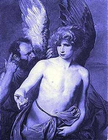 Icaro sta indicando nella direzione dell'osservatore, domandando perplesso la strada al padre, che, invece punta il dito verso il cielo.