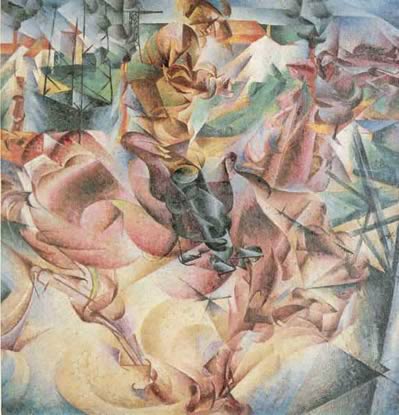 Abbiamo detto come, anche in pittura, il Futurismo punti alla rappresentazione del movimento, della velocità, del dinamismo; dopotutto non va scordato che adesso il nuovo modello di bellezza è l'automobile, e quindi anche in questo campo dell'arte (propriamente detta) si deve 'farle onore'. Non va dimenticato che un'altra importante esigenza di questa avanguardia italiana é la creazione di nuovo linguaggio, attraverso il quale esprimere i valori innovativi di cui si fa portatrice. Chi per primo affronta e approfondisce questa problematica è il pittore Umberto Boccioni (1882-1916). Non lo soddisfa più la semplice rappresentazione oggettiva della realtà e proprio questo, insieme alla sua volontà di dipingere la vita moderna, che lo caratterizza sin dagli inizi, lo porterà a incontrare Marinetti nel 1910. Lui punta però ad una diversa idea del movimento e della 'simultaneità', e lo fa descrivendo l'immagine in più punti della sua traiettoria.