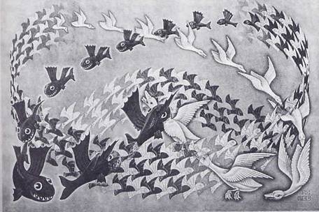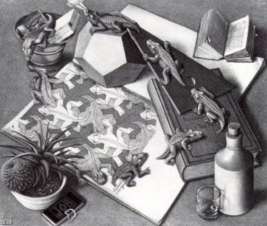 ".Il genio di Escher sta forse nella sua capacità di ritrarre idee matematiche astratte in termini di oggetti concreti e riconoscibili; molte metafore visive di Escher riguardano fondamentali concetti matematici astratti: simmetria, infinito, dimensionalità, dualità, trasformazione topologica, "oggetti impossibili" [.]. Forse per tutti questi motivi le sue immagini affascinano tanti matematici.".