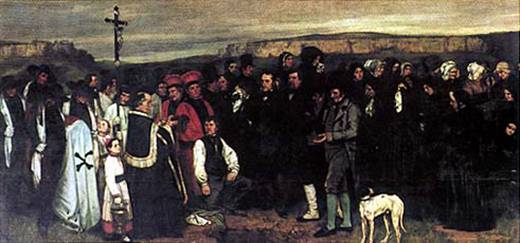 Si tratta di un'opera monumentale dipinta a Ornans, il paese natale di Courbet che ritrae, a grandezza naturale, persone reali, abitanti del luogo. Courbet dipinge il funerale di un uomo qualunque, quasi si fosse trovato a passare di lì per sbaglio. L''aspetto dimesso e umile dei partecipanti al funerale fa pensare che l'evento immortalato non fosse poi così storicamente importante. L'espediente della fossa aperta costringe lo spettatore a partecipare all'evento. Pur addensandosi in primo piano, le figure risultano compresse e appiattite sullo sfondo. I personaggi sono ripartiti secondo tre nuclei: a sinistra il clero, a destra le donne con i fanciulli e al centro le figure a cui l'autore intendeva attribuire maggiore importanza. In primo piano un cane vicino alla fossa. I colori dominanti sono molto scuri e contrastano con le macchie bianche dei drappi, dei mantelli e dei copricapi e con il rosso delle vesti dei notabili. Courbet ci mostra la scena con un'inquadratura quasi fotografica.