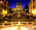 La monumentale scalinata di Trinità dei Monti progettata nel 1726 da Francesco De Sanctis e realizzata completamente in travertino. Scegliendo come nume ispiratore il numero tre, in onore della chiesa della Trinità, il De Sanctis crea una serie di rampe divise in tre parti che poi si congiungono e subito convergono in due direzioni in un alternarsi di pareti, di gradinate e piani di sosta.