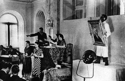 Appena entrati attraverso una stretta scalinata si accedeva alle prime stanze della mostra. Le tele, spesso senza cornice, erano state volutamente esposte in modo caotico e disordinato ed erano accompagnate da slogan sarcastici che puntavano a ridicolizzarle. Oppure erano accostate a disegni realizzati da veri malati mentali a titolo di confronto e di denuncia della corruzione.