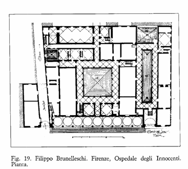 Nel 1421 veniva eletto Gonfaloniere di Giustizia Giovanni de' Medici. Il nuovo Gonfaloniere conquistò le simpatie del popolo intraprendendo una politica di opere pubbliche e assistenziali volte a dotare le città di attrezzature civili che si affiancassero a quelle religiose per sopperire alle nuove esigenze sociali. Nel programma edilizio venne compresa la costruzione dell'Ospedale degli Innocenti. Occupa un lato di una piazza; ma una piazza non è una scatola, è uno spazio aperto e frequentato, non si può chiuderla tra quattro pareti-saracinesche. La facciata di un edificio che ne formi un lato appartiene ugualmente all'edificio e alla piazza, deve mettere in relazione e in proporzione un volume pieno e uno vuoto. B. Pensa alle piazze antiche, porticate; pensa alla funzione urbana e sociale delle logge trecentesche fiorentine, concepite quasi come il simbolo stesso della città, coi suoi spazi comunitari a misura d'uomo. Progetta una facciata porticata o a loggia: una superficie in cui si inscriva una profondità, un piano in cui il volume pieno dell'edificio e il volume vuoto della piazza si compenetrino e si definiscano l'uno in rapporto all' altro «per comparatione», proporzionalmente. La proporzione tra i due volumi è espressa, su quel piano-diaframma, dalla misura degli archi a tutto sesto, dal rapporto tra la loro apertura e l'altezza delle colonne, e dall'apparente, prospettico scalare del piano superiore, a finestre. E' certo che le conoscenze prospettiche dell'artista poterono consentire la trasposizione dalle prospettive ideali e astratte dei pittori trecenteschi suoi contemporanei, così come le sue conoscenze di statica poterono fargli realizzare la leggerezza strutturale delle arcate , differenziate nettamente da quelle romane e romaniche. Nel portico B. introduce le volte a vela in luogo della volta a crociera, che aveva caratterizzato le architetture precedenti, e crea valori spaziali assolutamente originali, che serviranno da modello per tutto il secolo. Le esili colonne sormontate da capitelli corinzi offrono anch'esse nuovi parametri all'architettura rinascimentale che, da Firenze, si diffonderà in Toscana e nel resto d'Italia.
