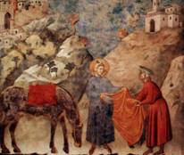 Francesco, che indossa un umile saio, dona al povero cavaliere il proprio mantello. Grazie al chiaroscuro le figure hanno volume e una certa naturalità: esse sembrano quasi proiettarsi verso di noi emergendo dall'affresco. Si nota la profondità del paesaggio, nel quale si trova un monastero e una città fortificata. Tutto è rappresentato secondo precise regole geometriche.