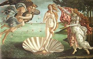 Venere appena nata dalla schiuma del mare, ma già donna, viene spinta dai venti verso la riva dove Flora l'accoglie. Si nota una bidimensionalità, le onde del mare sono increspature a 'V' e la costa è una linea. Venere ci appare fragile e delicata. Le spalle appaiono spiovente, il braccio sinistro è impossibile e il collo è troppo lungo.