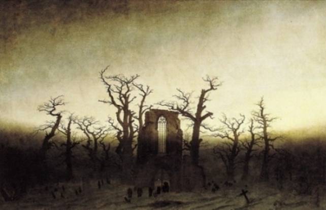Compare quindi un nuovo modo di approcciarsi a Dio: è infatti nell'idea che il paesaggio racchiuda una dimensione intima e infinita che nasce la concezione della natura come pura manifestazione di Dio, legame indistruttibile tra anima e cosmo. Nell'opera di Friedrich Abbazia nel querceto (1809, Berlino) i monaci, dipinti piccoli e senza volto, danno vita ad un lungo corteo spettrale, che procede in direzione delle rovine di un convento. La presenza umana è qui confinata in un angolo; gli uomini appaiono schiacciati dai simboli cristiani, che sono immersi in un cielo livido e in un sottile senso del mistero.