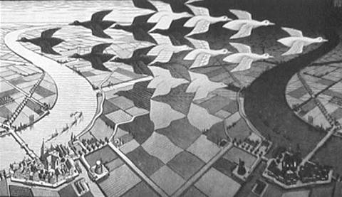 ".La maggior parte delle idee che Escher, dopo il 1937, tentò di esprimere nelle sue opere grafiche fa parte dell'osservazione, dell'esperienza e anche del sentimento comuni, eppure è impossibile catturarle appieno con le parole. Sono pensieri e percezioni che nei secoli hanno affascinato i filosofi e coloro che hanno riflettuto sulla poesia, sull'arte, la psicologia, l'ecologia, la chimica, la fisica, la medicina, la matematica. Le stampe rappresentano, e magari sfruttano, l'ambiguità nella quale gli esseri umani si dibattono quando osservano, rappresentano, interpretano e tentano di capire il mondo che li circonda. Come si può comprendere l'infinito? Esiste un confine tra due e tre dimensioni? Quello che vediamo è "reale"? Quali pensieri evoca una forma? La forma sullo sfondo ha una identità propria? Si può capire o sperimentare una cosa senza conoscerne l'opposto?". (estratto di pag. 239 di "Visioni della Simmetria" di D.Schattschneider).