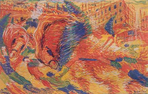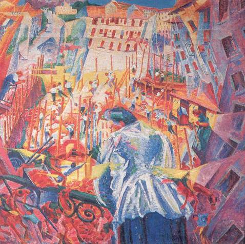 La città che sale è il frammento di una visione che prosegue oltre i limiti della cornice, la visione di un moto vorticoso inarrestabile, con linee-forza pluridirezionali, siano quelle costituite dall'accostamento di vivi colori o quelle geometriche della prospettiva con convergenza veloce a destra o ancora le verticali dei pali nel cantiere edile sul fondo (fig. 3).