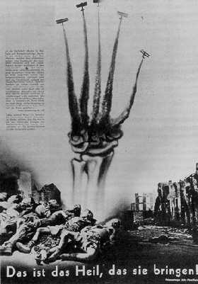 Nel '36 , presagio delle terribili distruzioni che la guerra futura avrebbe provocato in tutta Europa , Heartfield realizza un fotomontaggio agghiacciante , dal titolo tragicamente definitivo : "questo è il benessere che essi portano '' . Dallo scheletro di un avambraccio partano , al posto delle dita , le scie famose di cinque aerei , le pattuglie acrobatiche tanto esaltate nelle parate militari ; in basso , invece l'atmosfera è desolata , su un fondo di maceri , giace un mucchio di cadaveri .