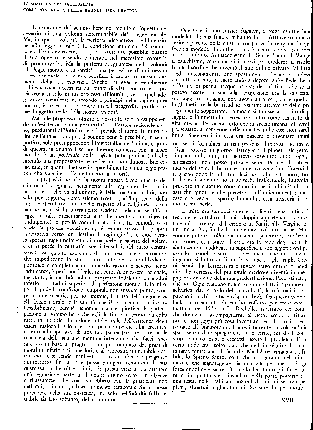 Nel contesto della filosofia kantiana, l'immortalità dell'anima riceve una singolare affermazione, benché le argomentazioni dialettiche ne abbiano smontato ogni giustificazione teoretica; è l'affermazione classica del postulato morale. L'immortalità dell'anima, impossibile a conoscersi e a dimostrarsi, diventa una necessità intrinseca al darsi della vita morale. Il primato della Ragion pratica si celebra anche a livello dell'immortalità personale. Quella di Kant è la via etica al riconoscimento dell'immortalità, infatti la ragione kantiana che, nel suo uso pratico, perviene sulla base del sentimento morale alla necessità di riconoscere il postulato, è ragione pura ed incompetente sul piano metafisico. La visione proposta da Kant ha due immediate e fondamentali conseguenze, giacché, in primo luogo, diviene una questione intimamente connessa con la concreta esperienza esistenziale ed interessa il destino dell'uomo e, in secondo luogo, la razionalità non è più estranea alla disputa ma interviene come struttura formale che garantisce coerenza e necessità logica ad una presa di posizione scaturita sul terreno pratico(caratterizzata dalla fede).