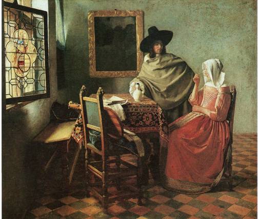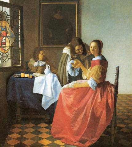 Due delle tele in cui Vermeer affronta il tema della tentazione e del processo di seduzione sono Il bicchiere di vino (Gentiluomo e dama che beve) e Giovinetta con bicchiere di vino (La dama con due gentiluomini), dipinti entrambi circa nel 1659.