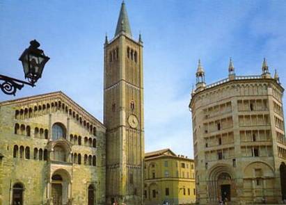 Piazza del duomo di Parma una delle piazze meglio conservate, dove almeno tre lati restituiscono la scena di una piazza medioevale, sera una piazza sagrato , qui il battistero è sulla destra di fronte al duomo , alle spalle il palazzo del vescovo, quindi una piazza totalmente volta ad essere il sagrato del