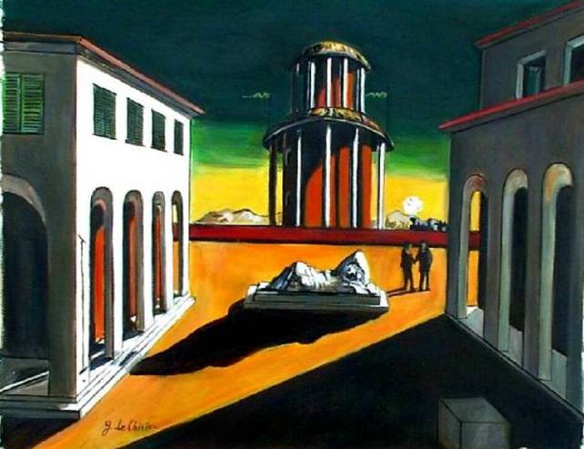 Giorgio De Chirico essendo profondamente legato alla cultura classica ha ben presente la piazza del foro romano e dell'agorà greca, si ispira a queste ultime ma le svuota completamente, ne toglie il volto umano, è una visione nuova e deformata dell'ambiente posta in una ambiente illogico simbolo dell'età contemporanea piena di simboli da decifrare.