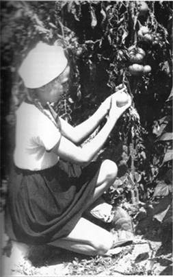 Ragazza che raccoglie i pomodori dall'orto di guerra di fronte alla stazione