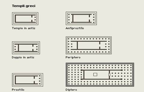 Il tempio comincia ad essere costruito fra l'VIII e il VII secolo a.C. sostituendosi al santuario domestico. Il tempio poteva essere grande o piccolo, semplice o complesso, ma in ogni caso doveva possedere una cella interna chiamata nàos, dove si trovava la statua del dio di dimensioni enormi e molto colorata, un atrio chiamato prònàos, costituito dal prolungamento delle pareti laterali del nàos. La basa su cui appoggiava il tempio era detto crepidoma. Poichè all'interno della cella erano ammessi solo i sacerdoti, lo sviluppo del tempio era soprattutto esterno:è fuori che si svolgeva il rito ed è da fuori che il tempio veniva osservato.