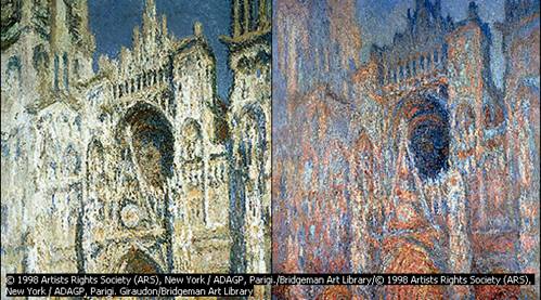 Sostituendo le sue tele col mutare della luce, Monet aveva seguito le diverse ore del giorno dal primo mattino, con la facciata immersa in un azzurro, al pomeriggio, quando è investita dal sole, fino all'imbrunire, quando il tramonto dileguandosi a poco a poco dietro gli edifici della città avvolge le pietre consumate dal tempo in uno strano tessuto arancio e blu.