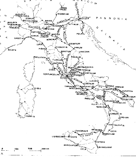 Il primo troncone della via Appia conduceva da Roma a Capua (S. Maria Capua Vetere) passando per Tarracina (Terracina), Formiae (Formia), Minturnae (Minturno), Casilinum (Capua), dove si univa con la via Latina. Fu prolungata per la prima volta nel 268 a.C. fino a Beneventum (Benevento), poi nel 190 a.C. fino a Venusia (Venosa), Tarentum (Taranto) e Brundisium (Brindisi). Sotto Traiano fu aggiunto un altro troncone (via Appia Traiana) da Beneventum a Brundisium per Canosa (Canosa) e Barium (Bari). La via Latina rasentava Tusculum, passava per Compitum, Frusino (Frosinone), Fregellae (Ceparano), Aquinum (Aquino), Casinum (Cassino), Teanum (Teano) e si univa alla via Appia a Casilinum.