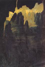 destra: Leonardo, La Vergine delle rocce, particolare del paesaggio (Parigi, Louvre)