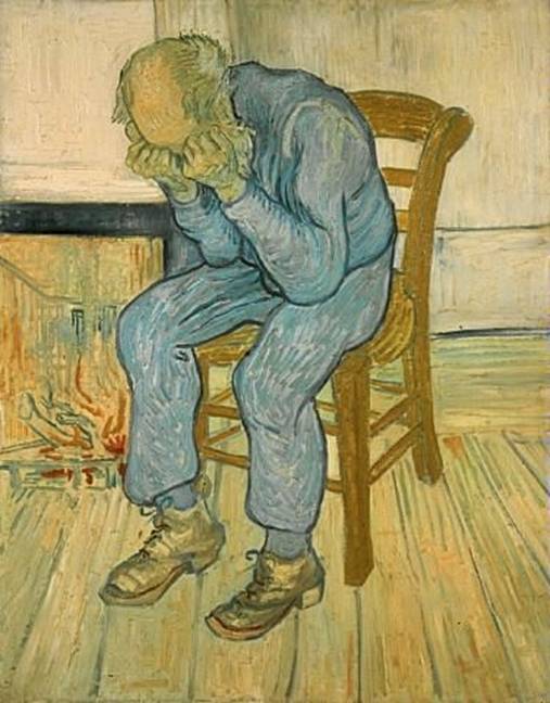 Tutti noi sappiamo che dobbiamo morire, ma in un angolo riposto del nostro cuore ci sentiamo immortali e non crediamo di dover vedere finiti i nostri giorni. Siamo invece terribilmente spaventati anche solo all'idea che le persone che amiamo possano scomparire. E' la sofferenza di fronte all'inevitabilità della morte e all'insicurezza del destino ultimo della vita umana che è rappresentato nel quadro di Van Gogh intitolato "Old Man in Sorrow" o, in altre interpretazioni, anche "Alle soglie dell'eternità". Esistono diverse versioni dello stesso soggetto anche in forma di litografia intitolata "Vecchio con le mani fra i capelli". Il dipinto qui riportato ritrae un vecchio che, seduto sulla sua sedia, che ricorda molto anche quella del dittico dedicato alla fine dell'amicizia con Gaugin, appoggia il viso sulle proprie mani strette a pugno, esprimendo un senso di profonda solitudine e di estrema disperazione, benché contenuta nell'intimo dei propri pensieri; non vi sono infatti gesti scomposti di sofferenza, ma solo un senso di profonda angoscia esistenziale. Il fuoco sulla sinistra potrebbe rappresentare il focolare domestico, data anche l'ambientazione interna, e collegare quindi lo stato d'animo del vecchio ritratto alla perdita di qualche stretto familiare; d'altra parte, però, rifacendosi all'antico mito greco di Demofonte[1], il fuoco può essere anche simbolo di una possibile immortalità dello spirito. Il vecchio, in questa mia interpretazione, supportata dalla lettura di alcune pagine del saggio di Kathleen Powers Erickson "At Eternity's Gate: The Spiritual Vision of Vincent Van Gogh", potrebbe allora rappresentare la disperazione e l'angoscia dell'uomo di fronte alla caducità della sua vita terrena, nonostante vi sia la possibilità di una immortalità ultraterrena, rappresentata dal fuoco ardente.