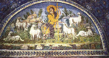 Puramente bizantini, invece, sono elementi di valore simbolico come la tunica dorata, l'aureola, la croce, non presenti nelle iconografie più antiche. Siamo ancora lontani dalle forme dell'arte cristiana medievale, che al naturalismo preferirà un simbolismo che stravolge le proporzioni e le prospettive, ma possiamo già analizzarne un tema portante (peraltro antichissimo, e rappresentato anche nelle catacombe di S. Callisto a Roma, del II sec. d.C.), parte del patrimonio di immagini semplici e accessibili a tutti elaborato dal Cristianesimo. Il pastore è ovviamente Cristo che ama e guida l'uomo.