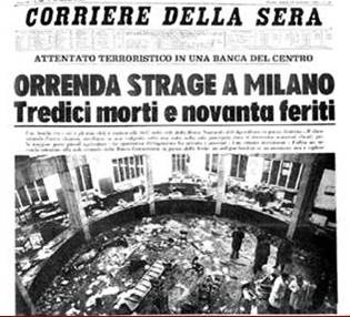 La strage di Piazza Fontana fu un attentato terroristico che avvenne il 12 dicembre 1969, una bomba fu fatta esplodere nella sede della Banca Nazionale dell'Agricoltura di Piazza Fontana nel centro di Milano, provocando la morte di sedici persone ed il ferimento di altre ottantotto.