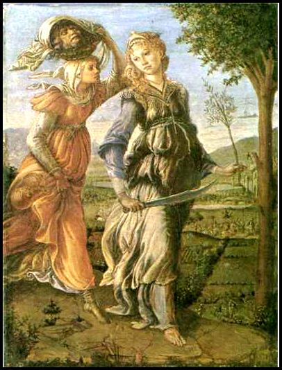 Quando Botticelli ha concepito la duplice scena, ha diviso i soggetti come parti in un mondo diverso. Oloferne apparteneva alla guerra, alla violenza, ai suoi soldati attendati fuori le mura. Giuditta, con la testa di Oloferne nelle mani a certificarne l'uccisione. Simbolo di pace per la sgomenta città. Giuditta reca in una mano la spada, strumento di morte, e nell'altra un ramo d'olivo, segno di pace. Il viso della giovane tradisce una forte emozione, triste al ricordo della macabra scena. Botticelli accentua qui la sua natura travagliata. Nell'animo di Giuditta trasferisce quei dubbi esistenziali che lo tormentano. Giuditta, come frastornata in un paesaggio freddo e distante, evita anche lo spettatore. Suoi occhi fissano un punto lontano, inesistente. La libertà, pagata così a caro prezzo; la vita, la sua e di tutta Betulia, barattata con la morte, una sola ma ugualmente una violenza innaturale. Tutti gli artisti descriveranno Giuditta con questo gesto definitivo.