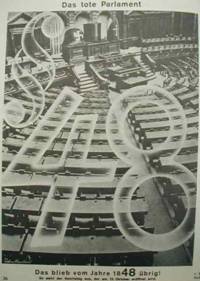 Con Il Parlamento morto (18 ottobre 1930) Heartfield critica aspramente questa svolta in senso autoritario, rappresentando la visione deserta del parlamento, sciolto da Brüning per aver condannato il suo uso eccessivo di decreti d'emergenza, durante la sessione del 13 ottobre. Il sottotitolo 'Questo è tutto quello che rimane del 1848!' sottolinea ironicamente come dalle richieste di partecipazione e rappresentanza democratica di quei moti, si sia invece arrivati ad un governo presidenziale autoritario. Nel 1933 Hitler ricorrerà allo stesso articolo della costituzione per abolire le fondamentali libertà dei cittadini. |