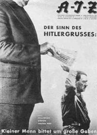 Con l'opera Milioni sono dietro di me (16 ottobre 1932) Heartfield denuncia l'appoggio dato a Hitler dalla grande industria e dai latifondisti agrari, riprendendo un motto che lo stesso Hitler aveva largamente usato prima di arrivare al potere per indicare la massa dei suoi sostenitori. Heartfield annuncia ironicamente: 'Il significato del saluto di Hitler: un piccolo uomo chiede grandi regali' e mostra la mano destra di Hitler accettare una mazzetta di banconote da un gigantesco borghese che sta dietro di lui. Ovviamente il finanziatore occulto non vuole farsi notare, motivo per cui il suo volto resta nascosto. |