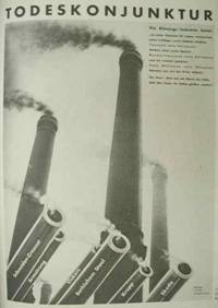 Conti economici per il business della morte (22 gennaio 1933) è accompagnata dalla seguente didascalia: 'Preghiera dell'industria delle armi: più cinesi cadono, più le nostre ciminiere fumeranno. Con un migliaio di cinesi morti ci ripaghiamo i costi. Centomila cinesi morti significano un profitto. Dieci milioni di cinesi morti potrebbero significare la fine della crisi. Signore, fa che il fuoco dell'Est bruci sempre di più!'. (Probabile allusione alla guerra civile in Cina, tra nazionalisti e comunisti, ma il significato è generale). Anche quest'opera indica negli interessi della grossa industria tedesca uno dei principali supporti alla politica hitleriana. |