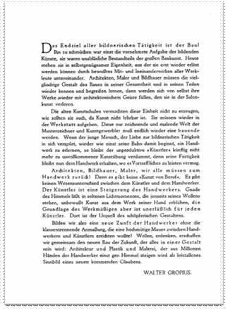 Gropius esprimeva nei confronti delle accademie, ree di educare un "proletariato artistico, non equipaggiato per