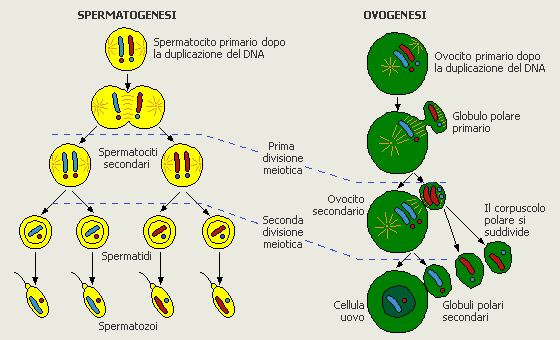 La spermatogenesi, è il processo di maturazione dei gameti maschili, gli spermatozoi. Dai protogoni con la mitosi si passa agli spermatogoni che mediante mitosi si trasformano in spermatociti primi, che divengono spermatociti secondi al termine della prima divisione meiotica, e quindi danno origine agli spermatici. La meiosi, produce quattro spermatidi apolidi, che non sono ancora funzionanti, quindi acquisteranno la mobilità grazie ad una trasformazione cellulare, detta spermioistogenesi.
