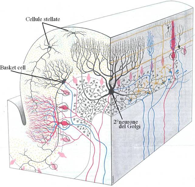 Il 2° neurone del Golgi è situato in prossimità delle cellule di Purkinje ed ha un assone breve che resta confinato nello strato molecolare; l'albero dendritico ha due estensioni, una apicale che si porta a prendere sinapsi con le fibre parallele, e un'altra che si porta in basso a prendere sinapsi con le fibre muscoidi. Forma sinapsi inibitorie con le cellule dei granuli. La cellula del Golgi è una delle poche cellule GABAergiche a possedere un albero dendritico caratterizzato da spine. La spina è un area particolare di trasmissione, computo e calcolo affinchè l'informazione venga processata prima di giungere al dendrita. Tutte le sinapsi saranno dunque assospinose . Questa cellula computa contemporaneamente 150.000 contatti sinaptici facendo uscire un solo messaggio al termine. Tutto ciò in un delta t di pochi millisecondi.