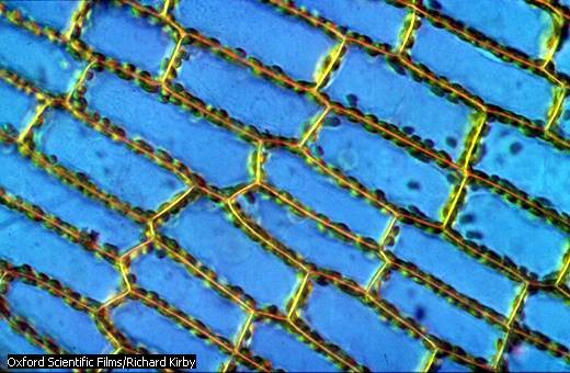 Un esame microscopico del tessuto vegetale rivela la presenza di piccoli organelli verdi di forma lenticolare detti cloroplasti, qui visibili nelle cellule dell'apparato radicale di una cipolla, addossati alle pareti cellulari. In essi ha luogo la fotosintesi, il processo mediante il quale da acqua, anidride carbonica e luce solare vengono sintetizzati glucosio e ossigeno.