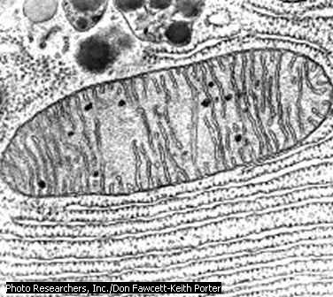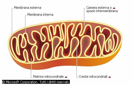 Mitocondrio: Nelle cellule eucarioti, organulo nel quale avvengono i processi di respirazione cellulare. I mitocondri sono presenti sia nelle piante sia negli animali. Hanno una forma ellittica e una lunghezza variabile di 2-5 µ. Sono delimitati da una membrana analoga alla membrana cellulare; all'interno possiedono una seconda membrana, ripiegata a formare caratteristiche creste. Fra le due membrane esiste uno spazio, denominato camera esterna; viene invece definito camera interna lo spazio compreso dalla seconda membrana. Lo spazio tra le due membrane prende il nome di stroma.