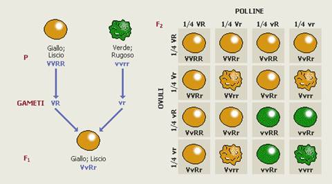 (semi rotondi - semi angolosi; semi gialli - semi verdi), ed ottenne ibridi monoibridi di prima generazione F1