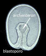 La gastrula è una struttura formata da un doppio strato cellulare che delimita una cavità, l' archenteron, comunicante all' esterno mediante un' apertura definita blastoporo. Successivamente si forma un terzo strato cellulare, il mesoderma, e si realizzano gli eventi che porteranno alla formazione degli organi principali. In posizione dorsale la parete dell'archenteron (mesoderma) forma un tubo che prende il nome di corda dorsale che costituirà l'asse di sostegno dell'animale. |