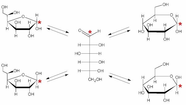 la forma aperta è al centro, a sinistra ci sono le forme cicliche furanosiche,