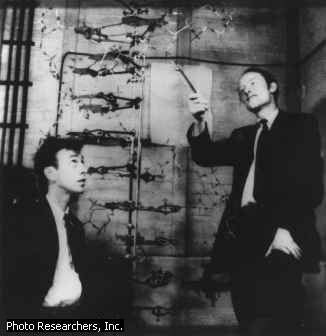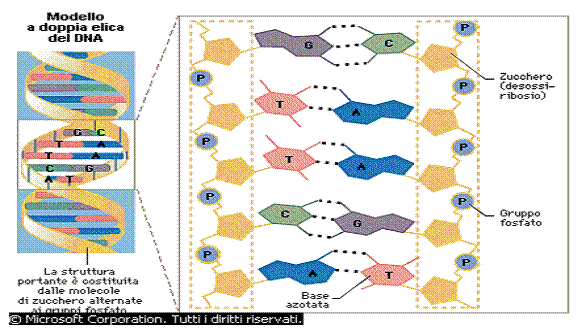 La struttura del Dna fu spiegata attraverso il modello "a doppia elica", proposto nel 1953 dal biochimico statunitense James Watson e dal biofisico britannico Francio Crick. L'aspetto complessivo della molecola del DNA, che è lunga 2 m. e larga 2.10 , è infatti paragonabile a quello che si otterrebbe avvolgendo su se stessa, ad elica, una scala di corda, in cui i cordoni laterali sono costituiti da molecole di acido fosforico e di zucchero alternati fra loro, e i pioli, equidistanti gli uni dagli altri, sono formati dalle basi azotate.