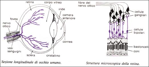 Le cellule della retina sono di due tipi: i coni sensibili ai colori ed i bastoncelli, sensibili alla quantità di luce. Sono proprio queste le cellule le deputate alla trasformazione del segnale luminoso (elettromagnetico) in segnale nervoso (elettrico) che può essere così recepito dal nervo ottico.