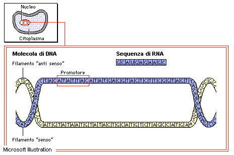 Il DNA è il depositario dell'informazione genetica che viene trascritta (cioè copiata) in molecole di RNA. L'RNA contiene il codice per sintetizzare specifiche proteine.